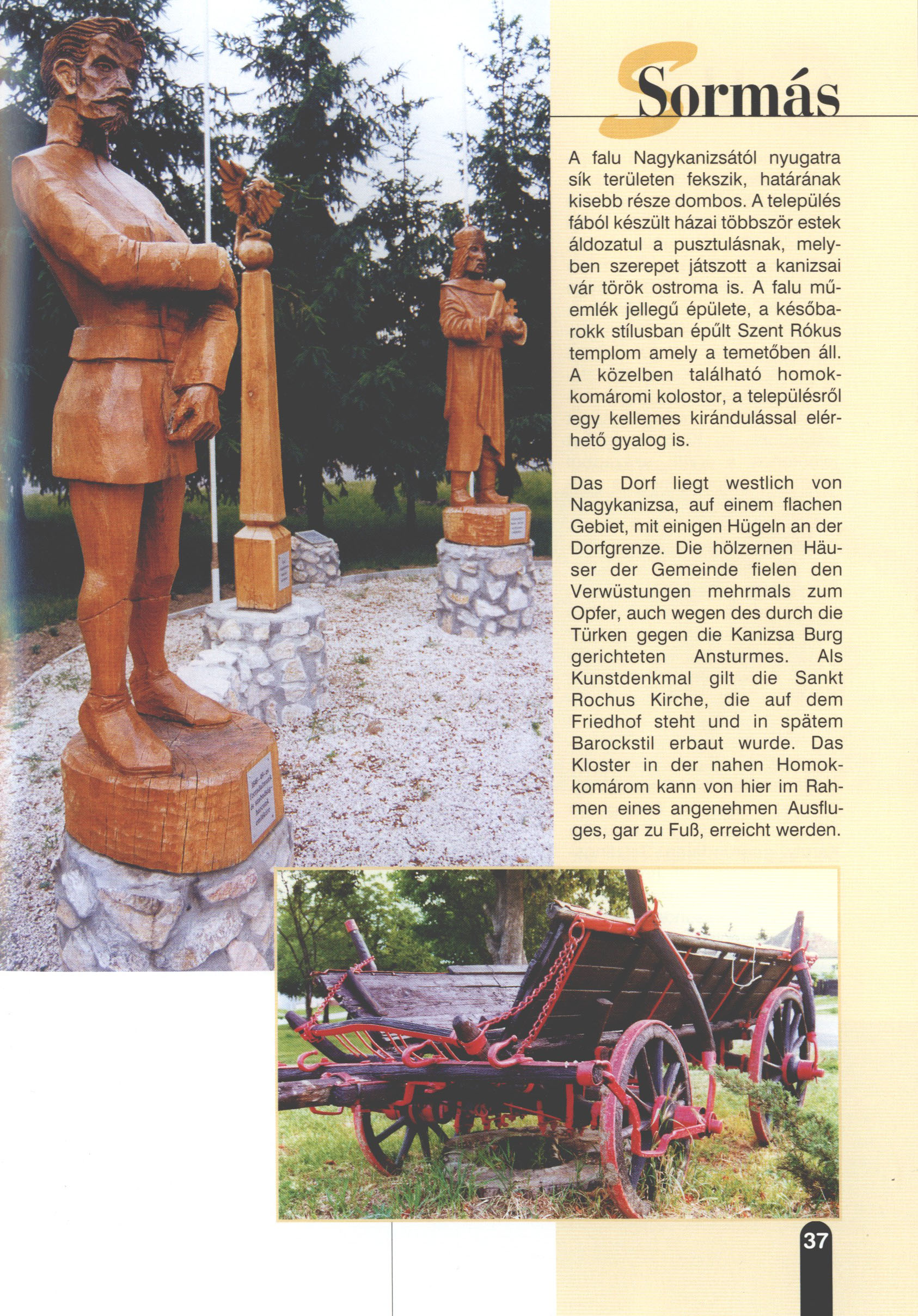 Nyilvános 2334 | 7989 | Sormás | Das Dorf liegt westlich von Nagykanizsa, auf einem flachen Gebiet, mit einigen Hügeln an der Dorfgrenze. Die hölzernen Häuser der Gemeinde fielen den Verwüstungen mehrmals zum Opfer, auch wegen des durch die Türken gegen die Kanizsa Burg gerichteten Ansturmes. Als Kunstdenkmal gilt die Sankt Rochus Kirche, die auf dem Friedhof steht und in spätem Barockstil erbaut wurde. Das Kloster in der nahen Homokkomárom kann von hier im Rahmen eines angenehmen Ausfluges, gar zu Fuß, erreicht werden. Dieses Text stammt von: Titel: Hívogató a Régiók Kapujában - Útikönyv Látnivalók Nagykanizsán és Térségében (Einladend in dem Tor des Gebiets - Reisebuch - Sehenswürdigkeiten in Nagykanizsa und Umgebung) Herausgegeben von: Nagykanizsa és a Környező Települések Területfejlesztési Társulása (Verein für Gebietsentwicklung in Nagykanizsa und in ihrer Umgebung) 8800 Nagykanizsa, Petőfi Sándor út 5. Tel.: 06 93/536-453 • 06 93/536-454 Tel ./Fax: 06 93/326-323 E-mail: terstars@axelero.hu www.kanizsaterseg.celodin.hu |