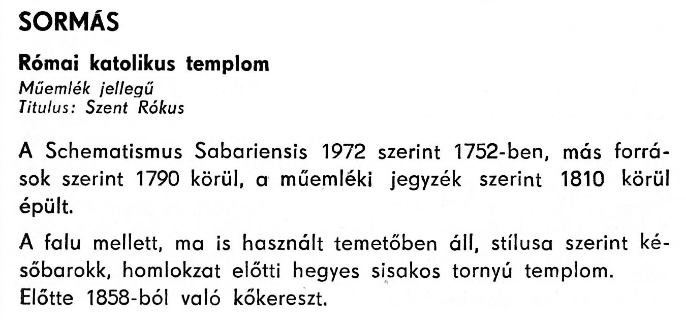 Nyilvános 1832 | 3770 | Sormás - Zala megye műemlékei 1977 083old | A részlet szövege: SORMÁS Római katolikus templom Műemlék jellegű Titulus: Szent Rókus A Schematismus Sabariensis 1972 szerint 1752-ben, más források szerint 1790 körül, a műemléki jegyzék szerint 1810 körül épült. A falu mellett, ma is használt temetőben áll, stílusa szerint későbarokk, homlokzat előtti hegyes sisakos tornyú templom. Előtte 1858-ból való kőkereszt. A részlet a következő könyvből származik: Cím: Zala megye műemlékei Szerző: Németh József (1928) Közreműködő: Lantos Miklós (fotó) Szerz. közl.: Németh József ; [fotók... Lantos Miklós] Kiadás: Zalaegerszeg : Zalai Ny., 1977 ETO jelzet: 72(439.121) ; 7.025.3/.4 ; 908.439.121 Tárgyszó: Zala megye Szakjelzet: 908 Cutter: N 53 Nyelv: magyar Oldalszám: 109 p. |