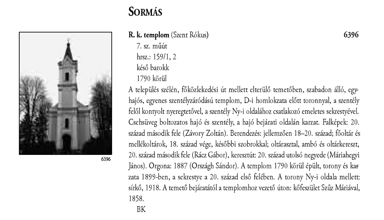 Nyilvános 2305 | 7952 | Sormás - Magyarország műemlékjegyzéke - Zala megye 2006 096old | A részlet szövege: SORMÁS 6396 R. k. templom (Szent Rókus) 6396 7. sz. műúthrsz.: 159/1, 2 késő barokk 1790 körül A település szélén, főközlekedési út mellett elterülő temetőben, szabadon álló, egyhajós, egyenes szentélyzáródású templom, D-i homlokzata előtt toronnyal, a szentély felől kontyolt nyeregtetővel, a szentély Ny-i oldalához csatlakozó emeletes sekrestyével. Csehsüveg boltozatos hajó és szentély, a hajó bejárati oldalán karzat. Falképek: 20. század második fele (Závory Zoltán). Berendezés: jellemzően 18–20. század; főoltár és mellékoltárok, 18. század vége, későbbi szobrokkal; oltárasztal, ambó és oltárkereszt, 20. század második fele (Rácz Gábor), keresztút: 20. század utolsó negyede (Máriahegyi János). Orgona: 1887 (Országh Sándor). A templom 1790 körül épült, torony és karzata 1899-ben, a sekrestye a 20. század első felében. A torony Ny-i oldala mellett: sírkő, 1918. A temető bejáratától a templomhoz vezető úton: kőfeszület Szűz Máriával, 1858. BK A részlet a következő könyv online változatából származik: Cím: Magyarország műemlékjegyzéke Közreműködő: Haris Andrea. (szerk.) ; Kulturális Örökségvédelmi Hivatal (Budapest) (közread.) ; Somorjay Sélysette. (szerk.) ; Bardoly István (közrem.) Szerz. közl.: [sorozatszerk. Haris Andrea, Somorjay Sélysette] ; [mtárs Bardoly István] ; [közread. a] Kulturális Örökségvédelmi Hivatal. Kiadás: Budapest : KÖH, 2006 Kötetadat: Zala megye ISBN: 963-86510-7-5 ö ISBN: 963 7474 10 2 Nyelv: magyar A jegyzék a Kultúrális Örökségvédelmi Hivatal honlapján, a következő link alatt található: http://www.koh.hu/index.php?_mp=nyitolap&_amp=MUEML A fejléc adatairól 1. Objektum neve – törzsszám A fejléc első sora a műemlék eredeti rendeltetésének megfelelő nevet tartalmazza. Mögötte zárójelben templom esetében annak titulusa, más épületeknél indokolt esetben az eredeti rendeltetéstől eltérő, mai használatra utaló intézmény név (pl. városháza, múzeum, szálloda, oktatási intézmény hivatalos neve, stb.) olvasható. A törzsszám (trsz.) a műemlék egyetlen soha nem változó adata. A gyors azonosítás, illetve a törzsszám szerinti keresés lehetősége végett az objektummal egy sorban, a fejléc jobb szélén kiemelten jelenik meg. Összetartozó műemlék részek vagy történetileg egy együttest alkotó műemlékek sokszor külön törzsszámon lettek műemlékké nyilvánítva. Előfordulhat ezért, hogy egy fejléc alatt a leíró részben több, külön törzsszámmal rendelkező objektum szerepel. A törzsszámot ezekben az esetekben is az objektummal egy sorban tüntetjük fel. 2. Utca, házszám Egy utcán belül, amennyiben a számozás ezt lehetővé teszi, először a templomot adjuk meg, ezt követi a parókia, majd egyéb objektumok, pl. szobrok következnek. Házszám nélkül említünk egyes műemlékfajtákat (elsősorban templomokat), amennyiben a topográfiai azonosítás szempontjából a házszám közömbös vagy éppen zavaró. Előfordul, hogy a műemlék nem köthető nevesített közterülethez. Az ilyeneket a település végéhez soroltuk, és a leírásban kitértünk a településen belül elfoglalt helyükre. 3. Helyrajzi szám Ha egy helyrajzi számon és egy címen (pl. temetőben) több, külön törzsszámmal védett objektum van, akkor az együttesre utaló műemlék megnevezés alatt a közös adatokat egyszer adjuk meg. Ezt követően külön címszavanként következik a műemlékek leírása. Ilyen esetben az emlékeket mutatóztuk. Ezt az eljárást követtük, tekintet nélkül arra, hogy a teljes együttes védett-e vagy sem. (Védett együttes mellett mindig törzsszám szerepel.) Ha több helyrajzi szám is tartozik egy törzsszámhoz, akkor a fejlécben valamennyi számot feltüntettük. Amennyiben ilyen esetben több elemből álló műemlékről van szó, akkor a leíró részben minden külön említett elem után zárójelben megadjuk a vonatkozó helyrajzi számot. 4. Stílus A műemléket jelenleg meghatározó, domináns stílusjegy alapján került meghatározásra. Egyéb, érzékelhető stíluselemekre a leíró részben utalunk. 5. Datálás A műemléket jelenleg leginkább jellemző építési dátum. Korábbi építési periódusokra, illetve későbbi átépítésekre a történeti részben utalunk, fennmaradt részletek esetén lehetőség szerint azokra vonatkoztatva. A leírás A műemlékek leírása tartalmilag öt szakaszból áll, amely folyamatos szövegként jelenik meg. Az objektum topográfiai meghatározása a műemlék településen belüli vagy ahhoz viszonyított helyét adja meg, amennyiben ez az azonosításhoz nélkülözhetetlen, avagy azt segíti. Az emlék jellegének leírása utal a környezettel való kapcsolatra (tájolás, beépítés módja, környező terepviszonyok, amennyiben ezek jellemzőek), alaprajzi elrendezésre, tömegre és a jellegzetes homlokzati elemekre (pl. rizalitok, erkélyek, stb.). Részletes homlokzatleírás nem volt cél. Belső építészeti részletet csak akkor említünk meg, ha ez tartozékként jelentős, esetleg a datálás vagy a stílus meghatározás alapjául szolgált. Ezt követi az épület tartozékainak és berendezésének utalásszerű ismertetése (falfestés, üvegablak, berendezés), az adott elem után zárójelben az ismert mesterek nevével; az orgonát külön említjük, amennyiben hangszerként is műemléki értékkel bír. A mesternevekre, berendezésre történő utalás jelzésszerű, tételes információért a KÖH műemléki nyilvántartásához kell fordulni. A leírást az építéstörténet lényegesnek ítélt momentumainak felsorolása követi, a fejléc tartalmának megismétlése nélkül. Csak olyan adatokat szerepeltetü