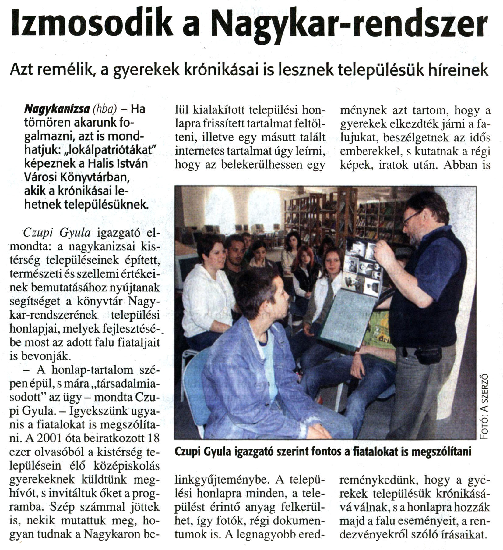 Nyilvános 14213 | 28431 | Zalai Hírlap 2008. június 9. 133. szám 12. oldal - Izmosodik a Nagykar-rendszer | A cikk szövege: Izmosodik a Nagykar-rendszer Azt remélik, a gyerekek krónikásai is lesznek településük híreinek Nagykanizsa (hba) - Ha tömören akarunk fogalmazni, azt is mondhatjuk: „lokálpatriótákat" képeznek a Halis István Városi Könyvtárban, akik a krónikásai lehetnek településüknek. Czupi Gyula igazgató elmondta: a nagykanizsai kistérség településeinek épített, természeti és szellemi értékeinek bemutatásához nyújtanak segítséget a könyvtár Nagykar-rendszerének települési honlapjai, melyek fejlesztésébe most az adott falu fiataljait is bevonják. - A honlap-tartalom szépen épül, s mára „társadalmiasodott" az ügy - mondta Czupi Gyula. - Igyekszünk ugyanis a fiatalokat is megszólítani. A 2001 óta beiratkozott 18 ezer olvasóból a kistérség településein élő középiskolás gyerekeknek küldtünk meghívót, s invitáltuk őket a programba. Szép számmal jöttek is, nekik mutattuk meg, hogyan tudnak a Nagykaron belül kialakított települési honlapra frissített tartalmat feltölteni, illetve egy másutt talált internetes tartalmat úgy leírni, hogy az belekerülhessen egy linkgyűjteménybe. A települési honlapra minden, a települést érintő anyag felkerülhet, így fotók, régi dokumentumok is. A legnagyobb eredménynek azt tartom, hogy a gyerekek elkezdték járni a falujukat, beszélgetnek az idős emberekkel, s kutatnak a régi képek, iratok után. Abban is reménykedünk, hogy a gyerekek településük krónikásává válnak, s a honlapra hozzák majd a falu eseményeit, a rendezvényekről szóló írásaikat. Képaláírás: Czupi Gyula igazgató szerint fontos a fiatalokat is megszólítani |